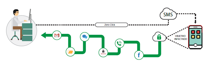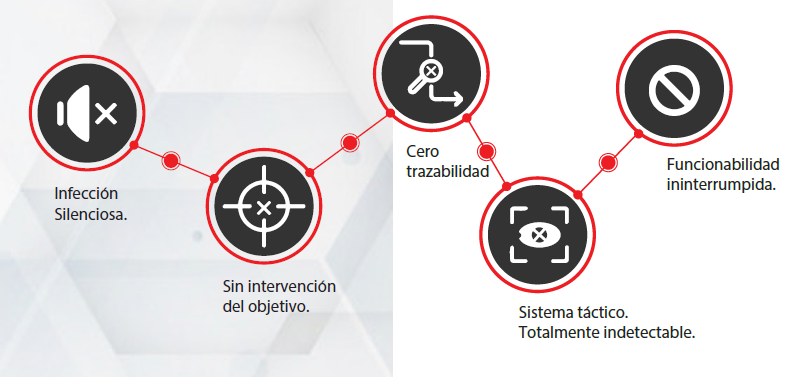 La infección se realiza mediante un mensaje SMS invisible enviado desde el sistema hacia el teléfono objetivo utilizando únicamente su número telefónico. Una vez enviado el sistema fuerza al objetivo a descargar un virus, el mismo se instala en “Background” sin alertar o noticar al usuario. Este virus es totalmente indetectable , con cero trazavilidad y imposible de erradicar una vez instalado. A demás no es visible ante los equipos de extracción forense si se realiza una pericia en el teléfono.